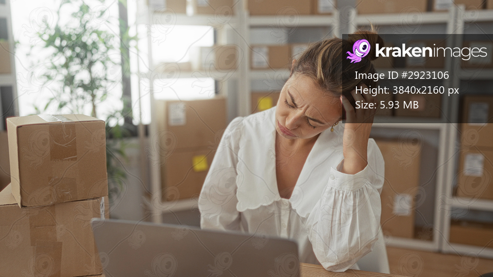 Woman with package touching head while seated at laptop in building full of boxes and shelves; small business stress.