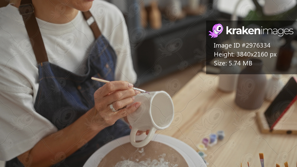Woman painting ceramic mug holds handle with left hand and paints rim with small brush in a studio; quiet concentration.