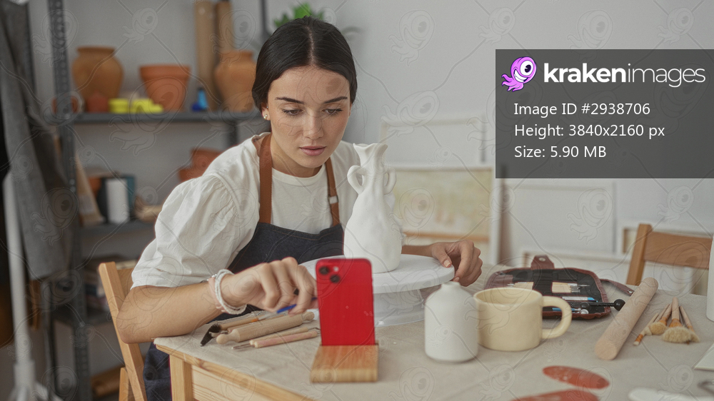 Woman paints ceramic vase with brush, hand steadying pot on turntable in studio; quiet concentration.