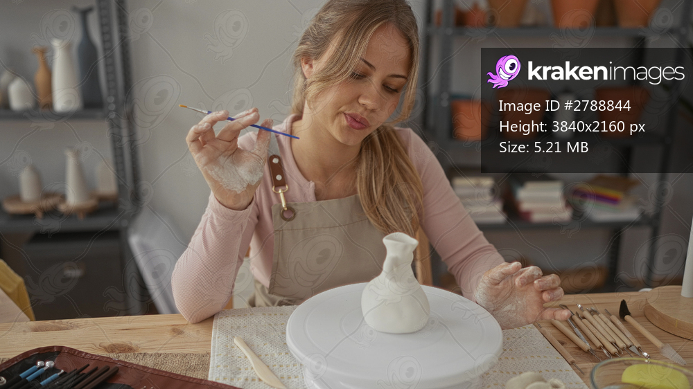 Woman paints ceramic vase with clay coated hands on spinning wheel in pottery studio; creativity focus craftsmanship serenity.