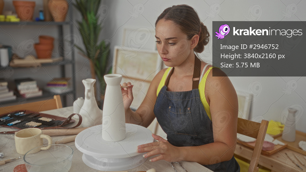 Woman paints ceramic vase with small brush on a rotating turntable in studio; quiet concentration and craft.