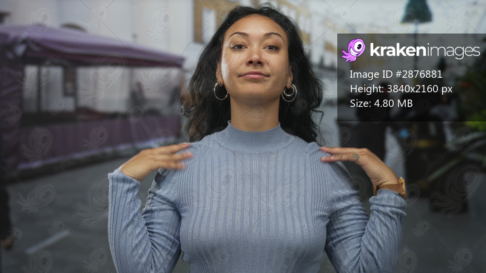 Woman with palm down dismissive gesture and crossed arms wearing a light blue ribbed sweater on street market backdrop; confidence.
