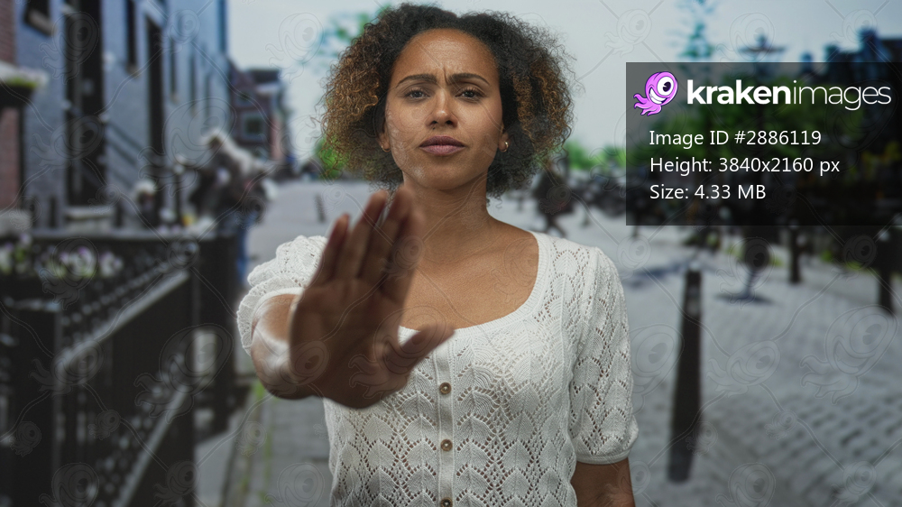 Woman with palm forward stop gesture on city street, hand raised toward camera at chest level; boundary defiance.