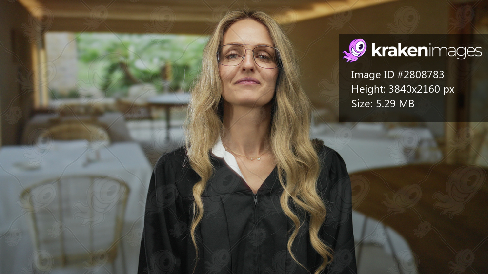 Woman with palm pointing gesture stands in a restaurant as a young blonde judge wearing a black uniform indoors while smile conveys confidence.