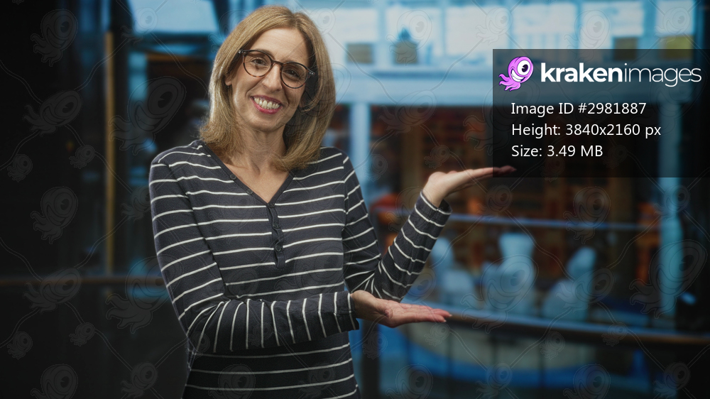 Woman palm up presenting with open hands and smile inside a building atrium, pointing to an unseen product; friendly welcome.