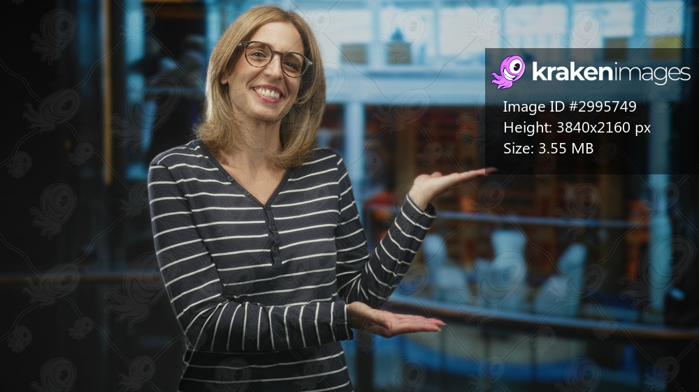 Woman palm up presenting with open hands and smile inside a building atrium, pointing to an unseen product; friendly welcome.