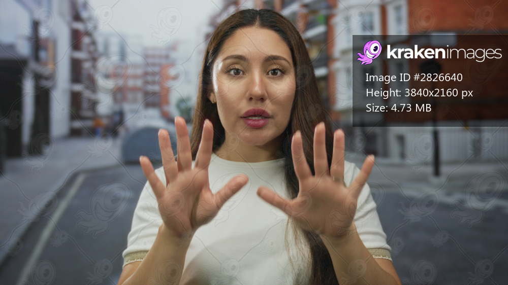 Woman with palms facing forward raises both hands in a stop gesture on a busy street in the city; denial.