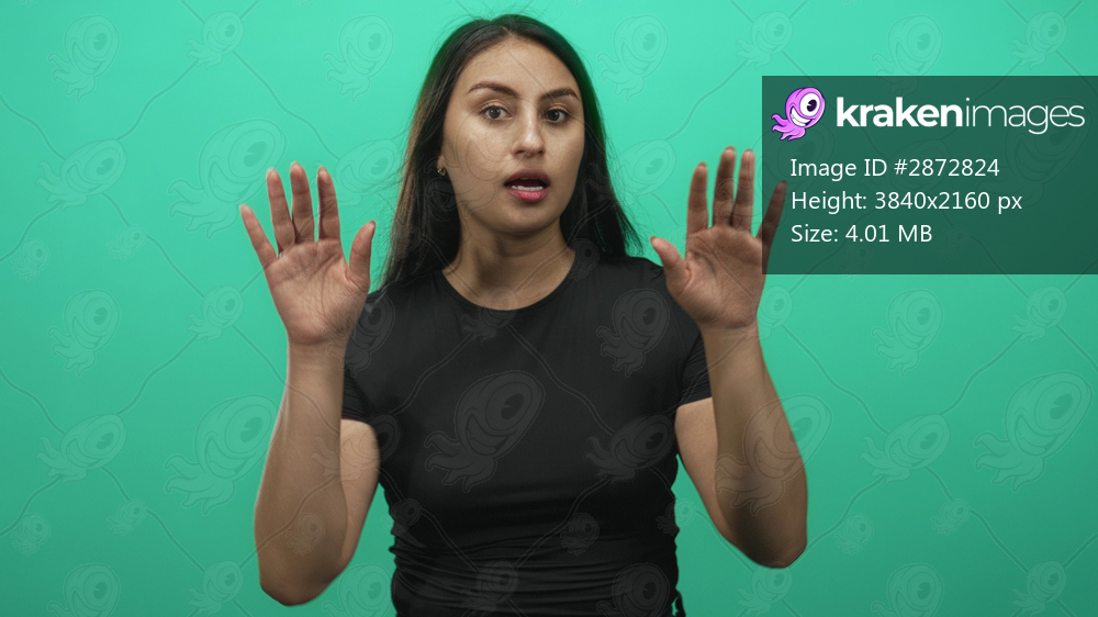 Woman with palms out and hands raised, open mouth in a green studio setting, facing camera; surprise caution alert pause.