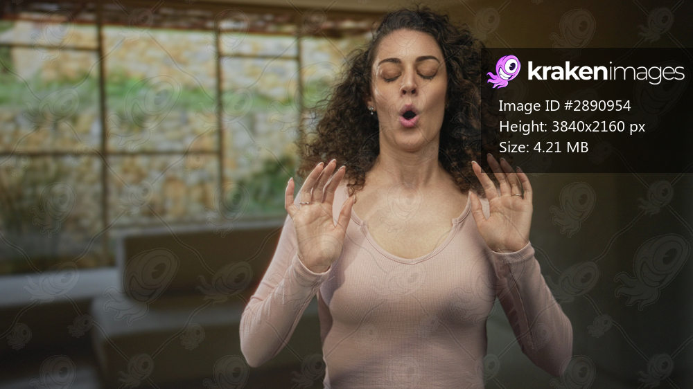 Woman with palms out, hands raised and pursed lips inside a living room building; caution mindfulness.