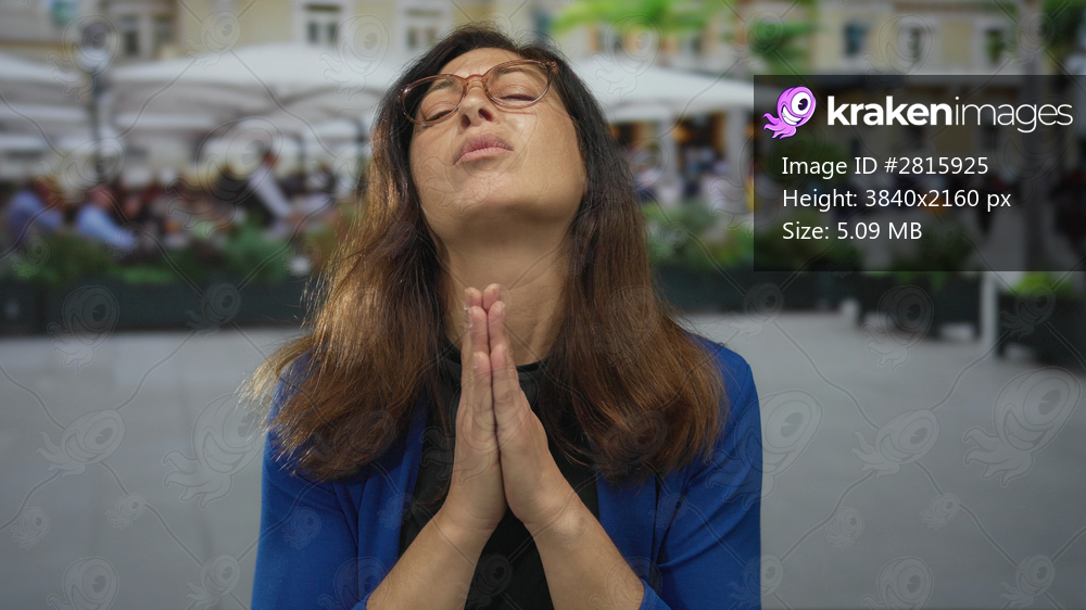Woman with palms pressed together in prayer gesture on a restaurant terrace in front of urban building; hope faith.