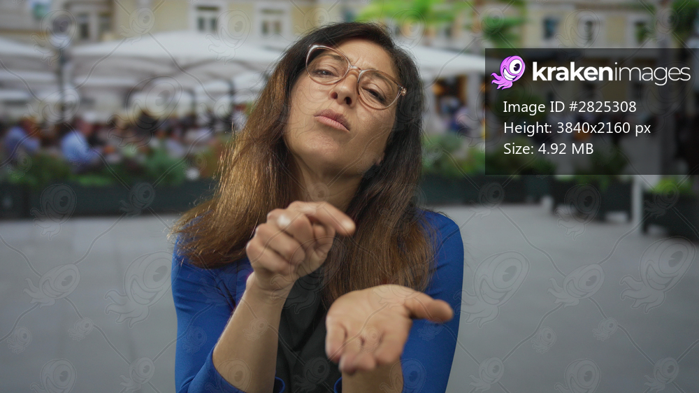 Woman with palms pressed together in prayer gesture on a restaurant terrace in front of urban building; hope faith.