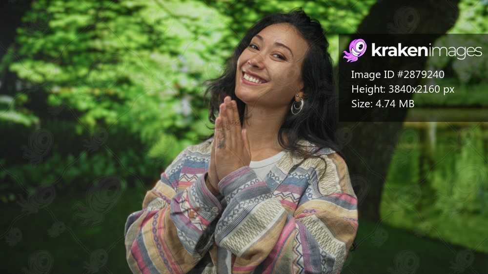 Woman with palms pressed together near chest in green park by a tree, smiling warmly and looking at viewer; joy gratitude.
