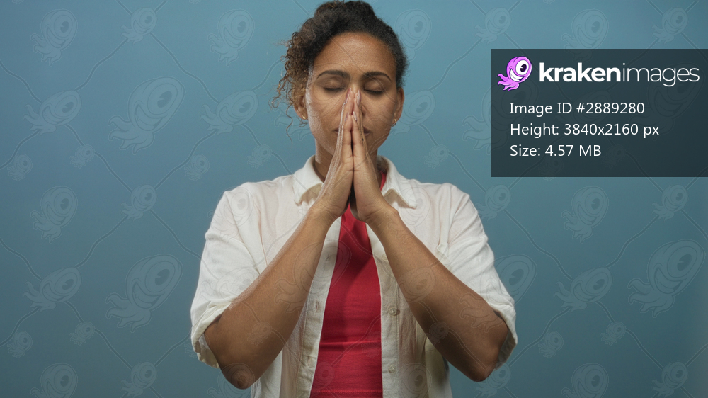 Woman with palms pressed together praying with eyes closed in studio with blue backdrop; calm reflection.