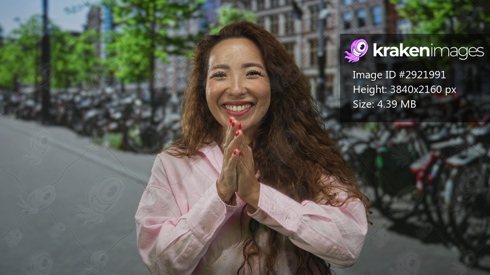 Woman with palms pressed together and smiling at camera on busy street in amsterdam wearing pink shirt and showing hands with red nails; gratitude joy. - Kraken Images
