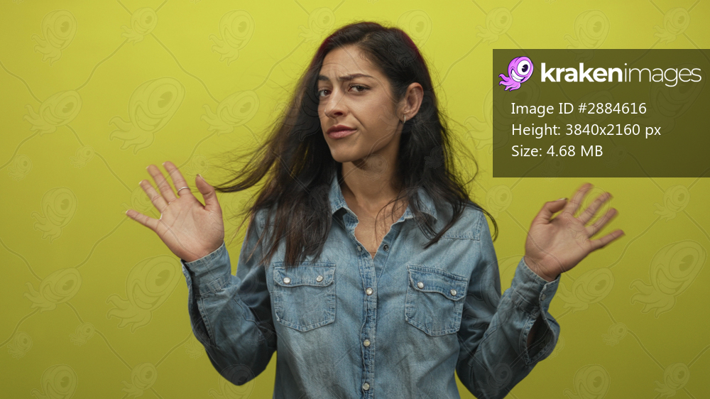 Woman with palms raised and an unsure shrug gesture in a yellow studio wearing a denim shirt and rings on fingers; skepticism.