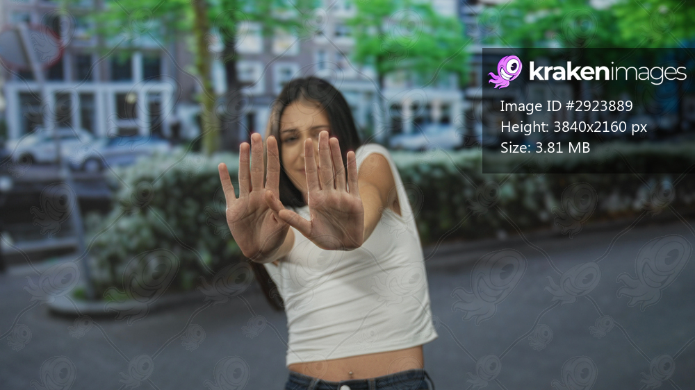 Woman with palms raised, hands blocking camera, shielding her face and pushing away on street lined with parked cars and green trees; fear personal boundary. - Kraken Images