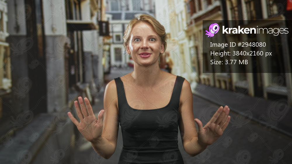 Woman with palms raised and hands open in a stopping gesture on a narrow cobbled street wearing a black tank top; calm reassurance.