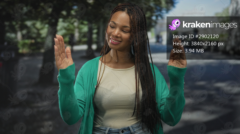 Woman with palms raised, hands open on street near trees and bench wearing green cardigan and jeans, smiling; peaceful reflection.