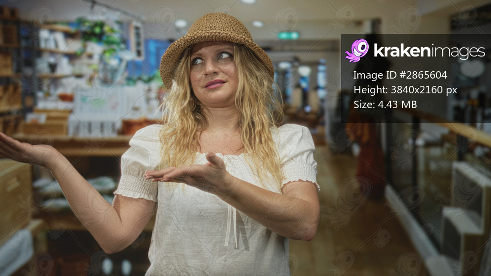 Woman palms up gesture in a home decor shop building, straw hat and white blouse, open hands toward shelves and counters while speaking to camera; confusion. - Kraken Images