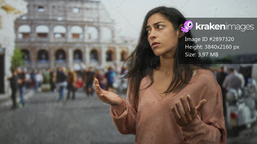Woman with palms up gesture standing before the roman coliseum building, hands open and questioning, wearing a dusty pink sweater and visible bare hands; frustration. - Kraken Images