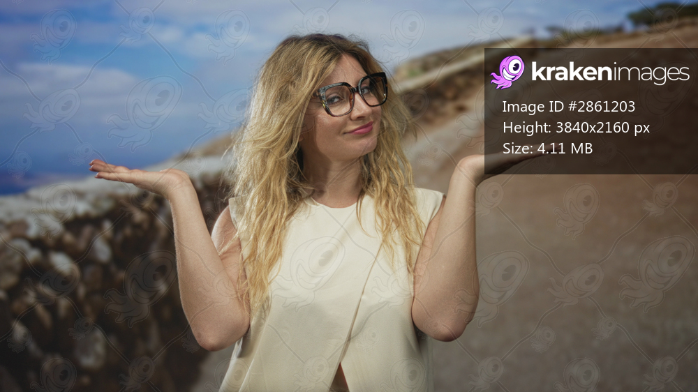 Woman with palms up and glasses shrugging on a coastal street beside stone wall, hands open in questioning gesture; uncertainty.