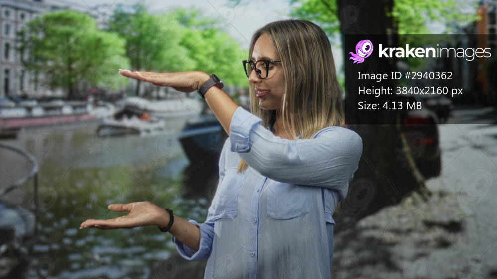 Woman with palms up hand gesture by canal street in amsterdam, wearing glasses and light blue blouse and smartwatch, framing empty space between hands; calm contemplation. - Kraken Images