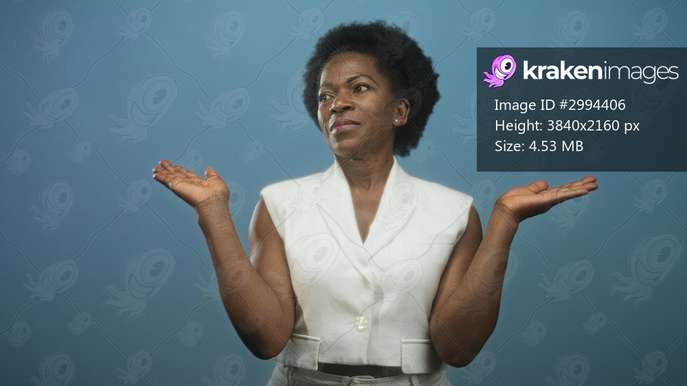 Woman with palms up hands raised and smiling while shrugging in studio, wearing white sleeveless vest; joy confidence.