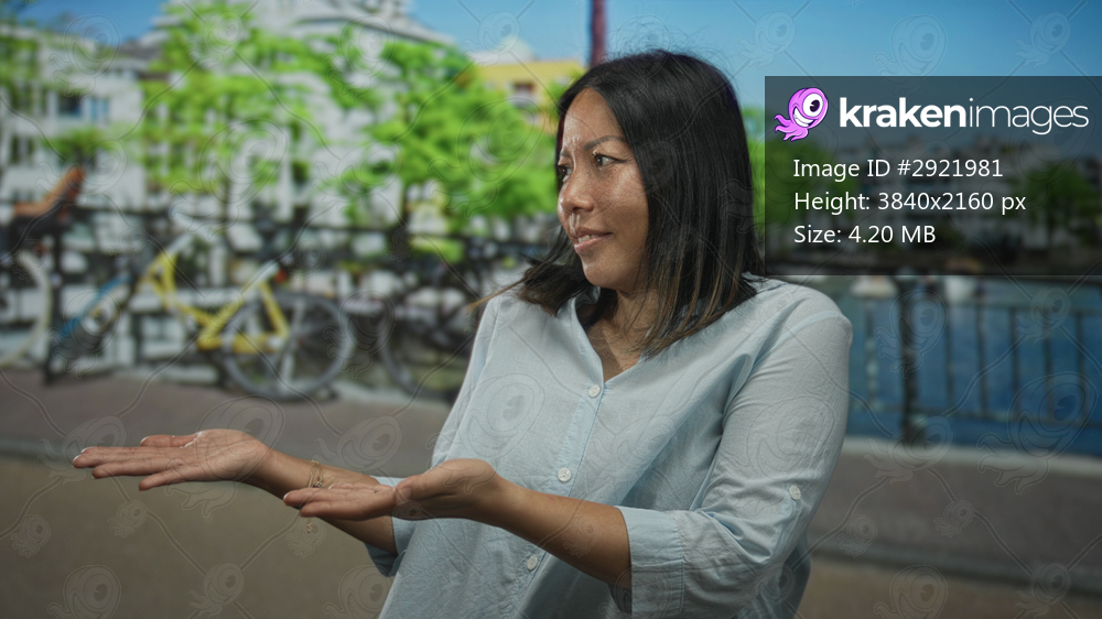 Woman with palms up on a canal street in amsterdam by bicycles and railing, open hands presentational gesture and casual shirt visible; curiosity.