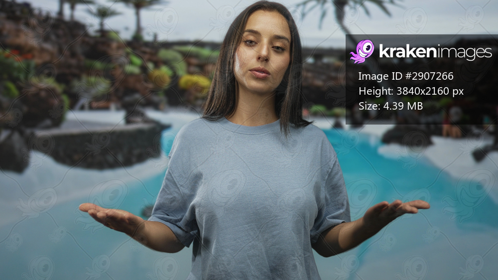 Woman palms up open hands at pool in outdoor resort wearing casual tshirt with neutral expression and slightly closed eyes; serenity reflection.