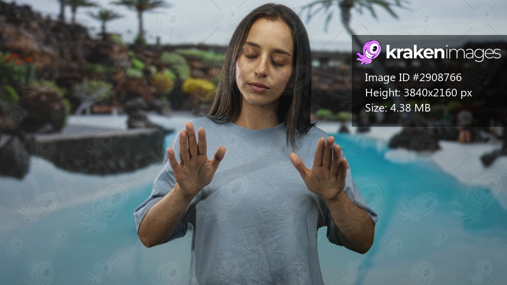 Woman palms up open hands at pool in outdoor resort wearing casual tshirt with neutral expression and slightly closed eyes; serenity reflection.