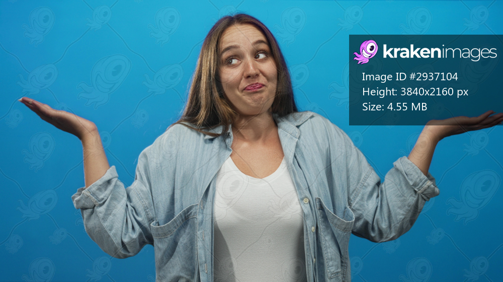 Woman with palms up shrug gesture against blue studio wall wearing white tank and denim shirt; uncertainty.