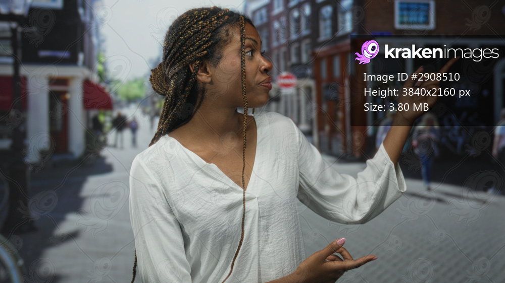 Woman palms up shrug with outstretched hands on a busy city street near storefronts, wearing a white blouse and smiling; casual curiosity playful.