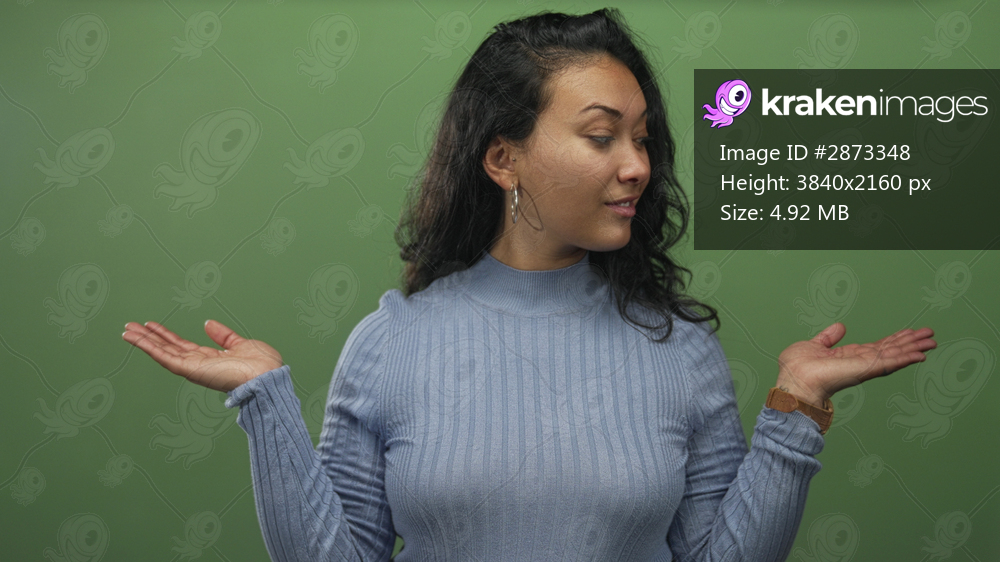 Woman with palms up shrug showing bare hands in green studio set, wearing blue sweater and hoop earring; uncertainty choice.
