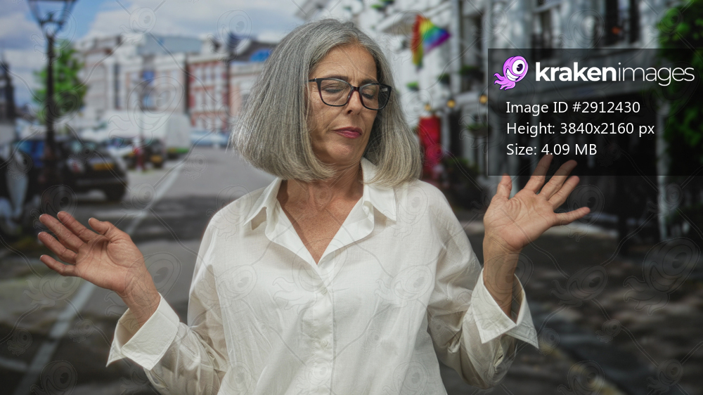 Woman with palms up shrug showing hands and eyeglasses, grey hair and open white shirt on a city street; confusion resignation.