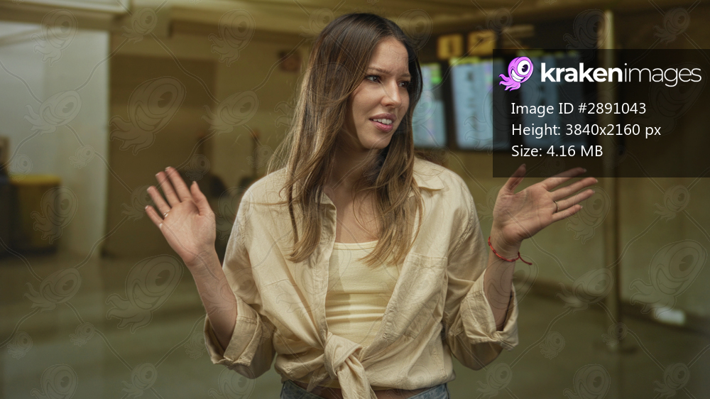 Woman with palms up shrugging in an airport terminal by a departure board wearing tied shirt and red bracelet; travel delay uncertainty.