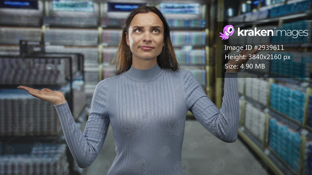 Woman palms up shrugging in retail building aisle surrounded by shelves and packages; confusion choice.