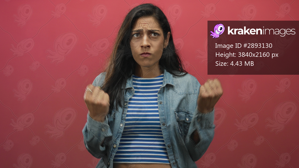 Woman palms up shrugging and looking upward in a pink studio wearing striped crop top and denim jacket; uncertainty hesitation.