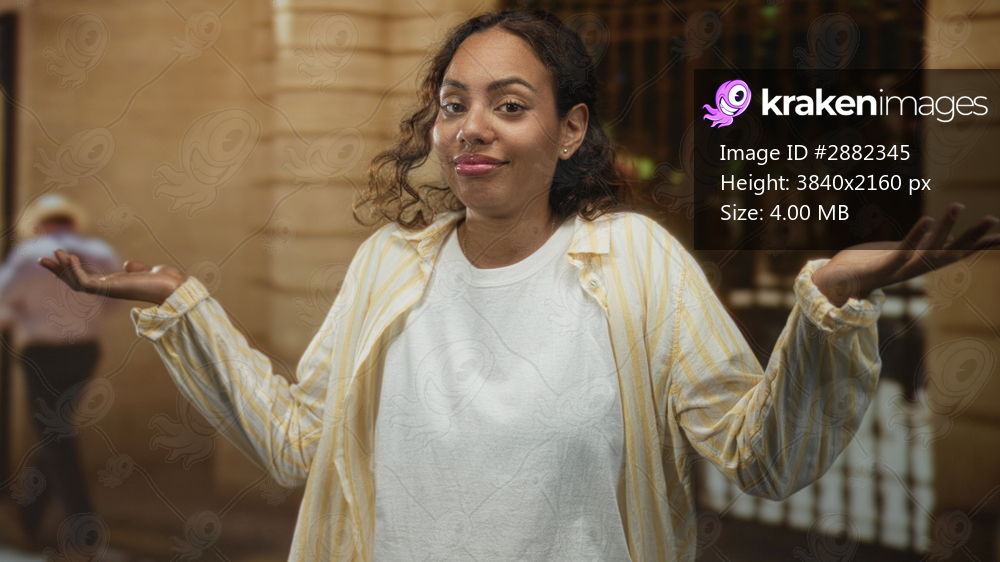 Woman with palms up shrugs in front of building entrance, wearing white tee and striped shirt, hands slightly raised in casual pose; casual indifference. - Kraken Images