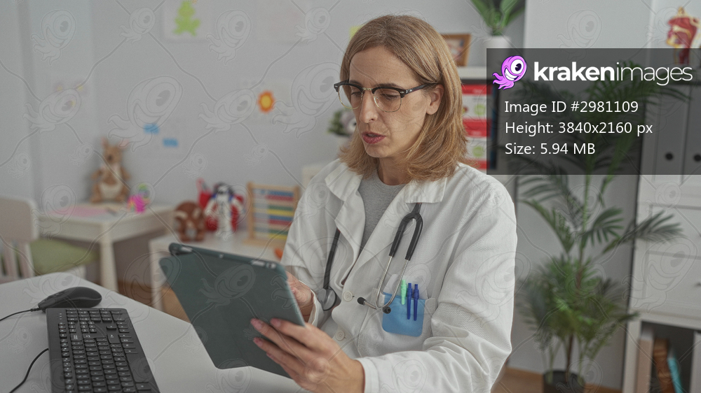 Woman pediatrician in labcoat holds tablet and stethoscope, tapping screen in pediatric clinic; calm reassurance.