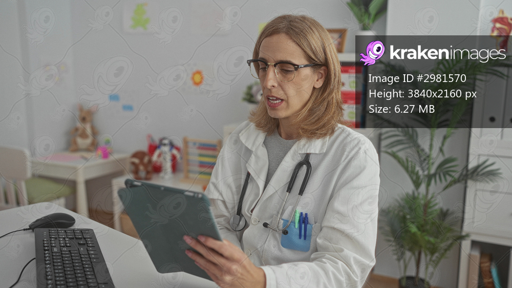 Woman pediatrician in labcoat holds tablet and stethoscope, tapping screen in pediatric clinic; calm reassurance.