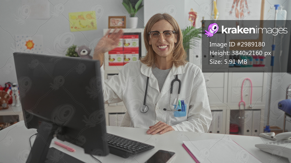 Woman pediatrician in white coat waves hand with stethoscope at computer in clinic building; reassurance friendly care.