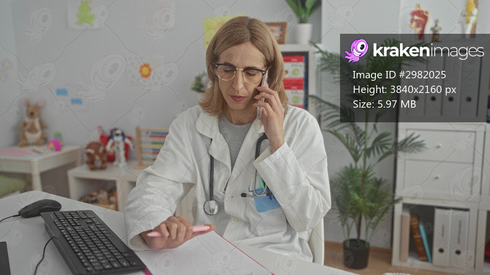 Woman pediatrician with stethoscope and glasses holds phone to ear while writing on clipboard beside keyboard and monitor in building; calm professional care. - Kraken Images