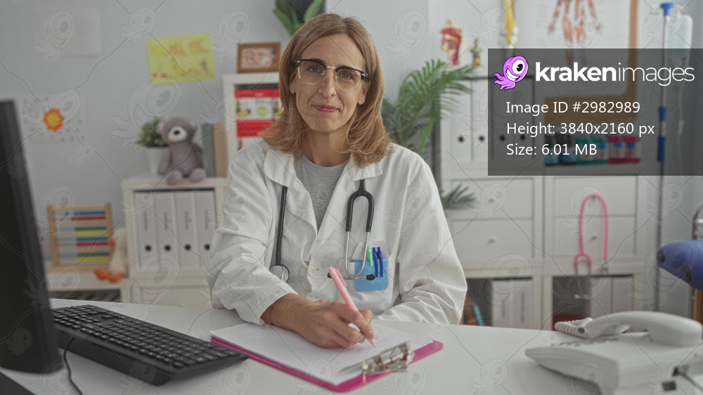 Woman pediatrician writes notes with stethoscope and visible hand at clinic building, seated at desk with clipboard; child health empathy.