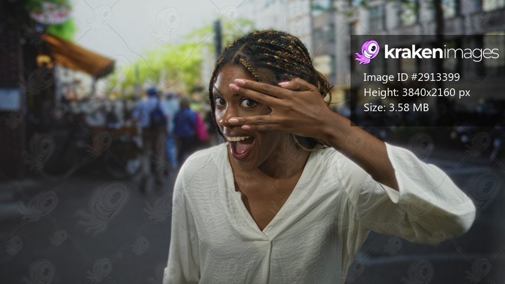 Woman peeking through fingers with hand covering one eye on a crowded urban street, smiling wide and leaning forward; playful curiosity.