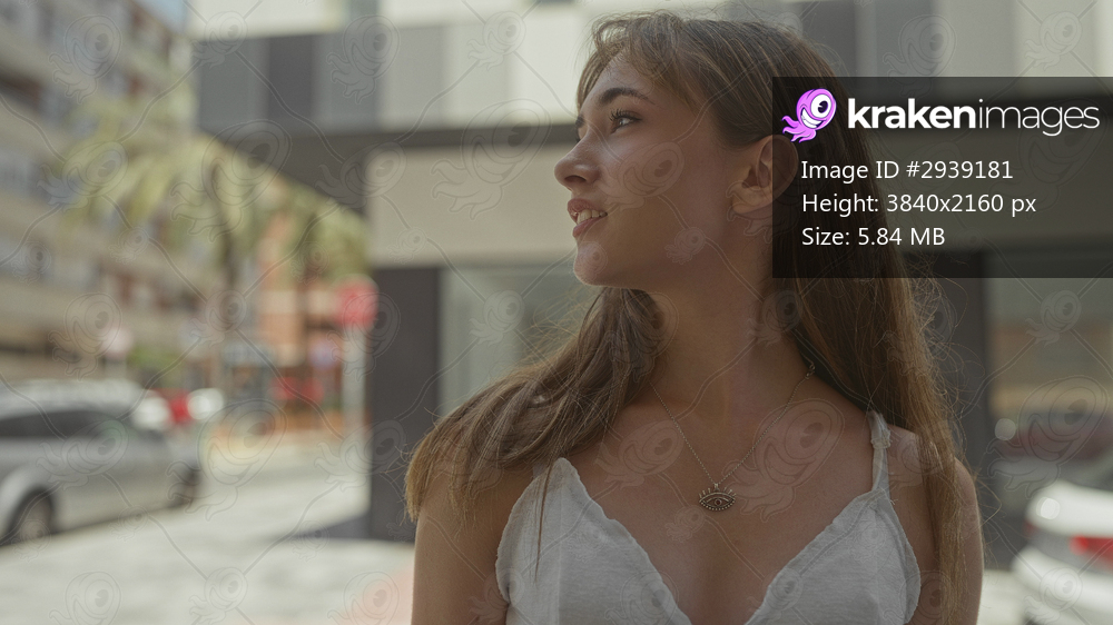 Woman with pendant necklace looking up on street with bare shoulders visible; curiosity youth exploration.