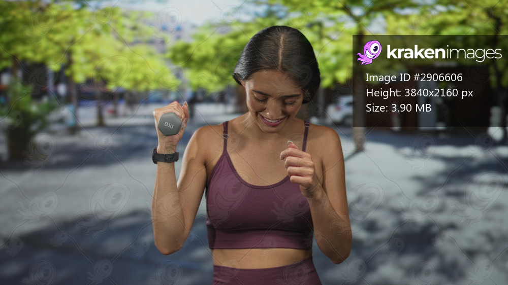 Woman performing bicep curl with 1kg dumbbell on street showing bare midriff and bicep; fitness joy.