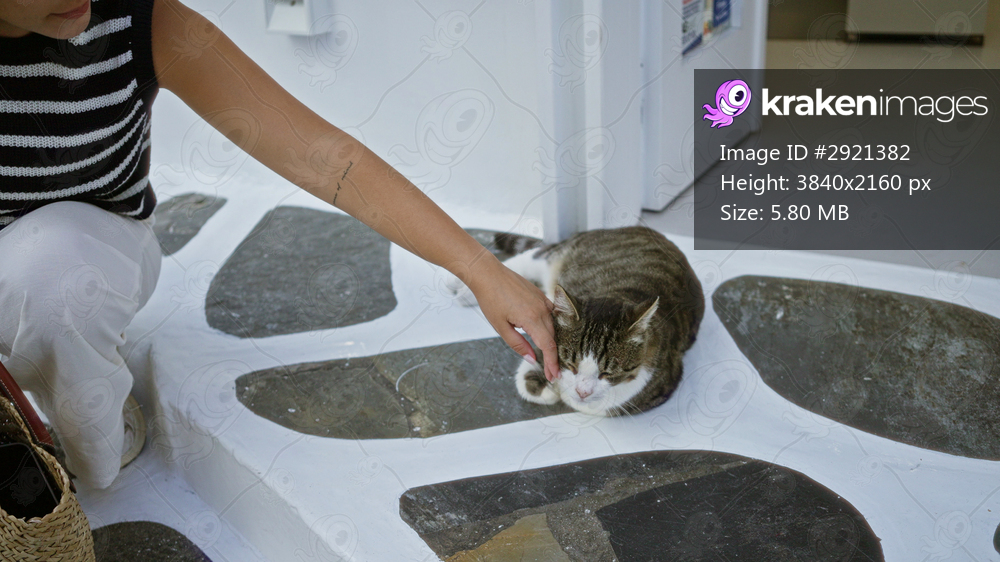 Woman pets tabby cat with bare hand on mykonos white stone street, arm extended toward animal in town doorway; serenity affection.