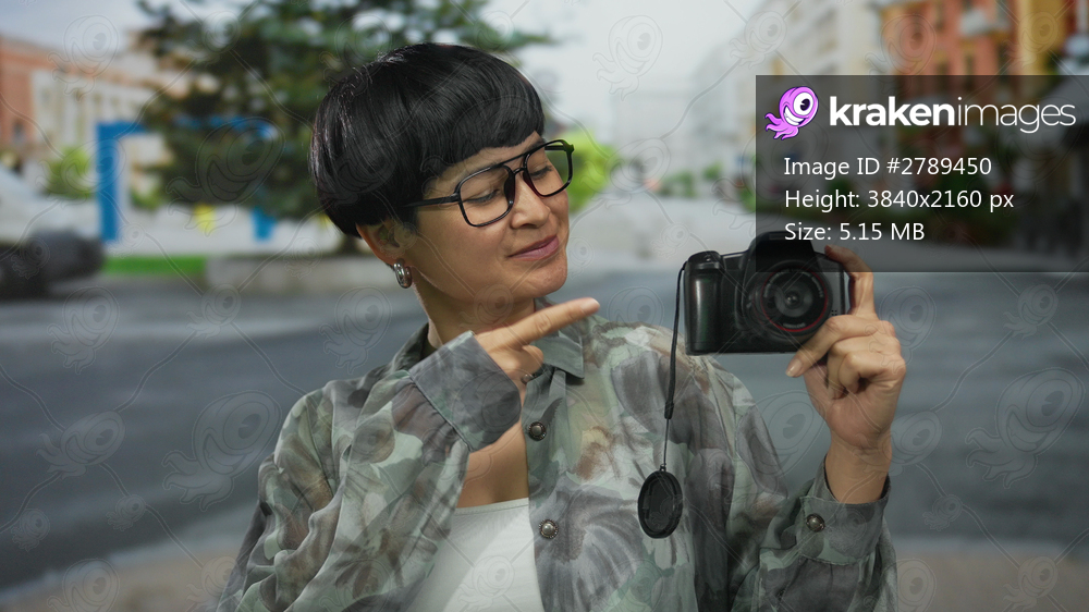 Woman photographing street in city with camera wearing glasses and stylish outfit showcasing urban life outdoors and lifestyle exploration.