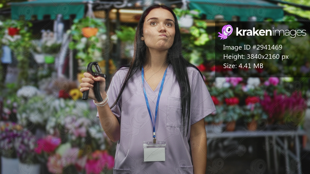 Woman physiotherapist holding handgrip in hand at street market stall wearing scrubs and badge; calm thinking.