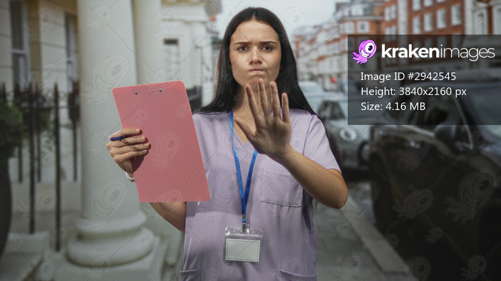 Woman physiotherapist holding pink clipboard with visible id badge, hand raised palm out stop gesture on street; safety warning.